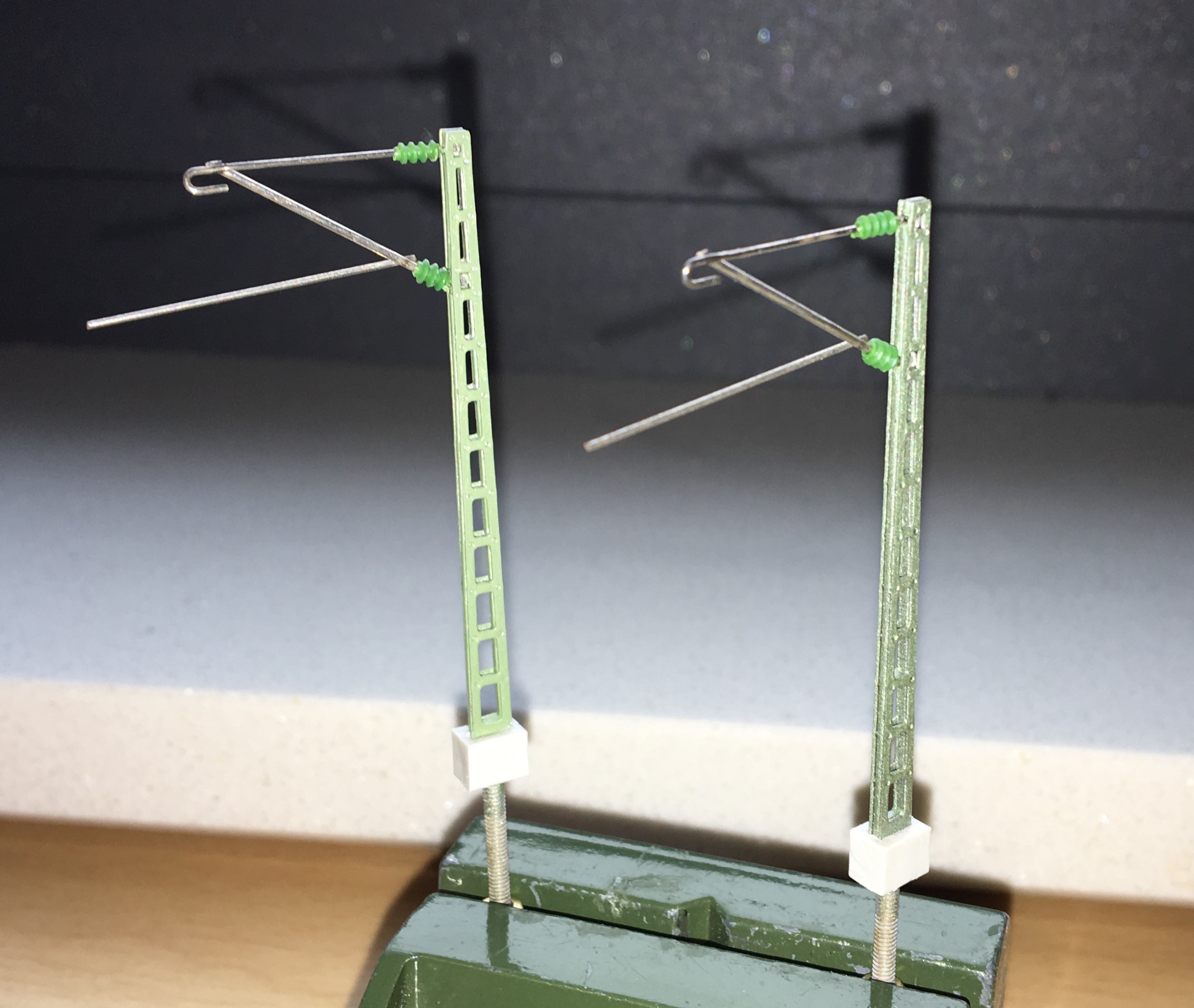 Auf dem Streckenmodul habe ich Masten von Sommerfeldt eingesetzt. Aber auf einem Segment wollte ich Abspannwerk darstellen, da habe ich Masten von Viessmann genommen.