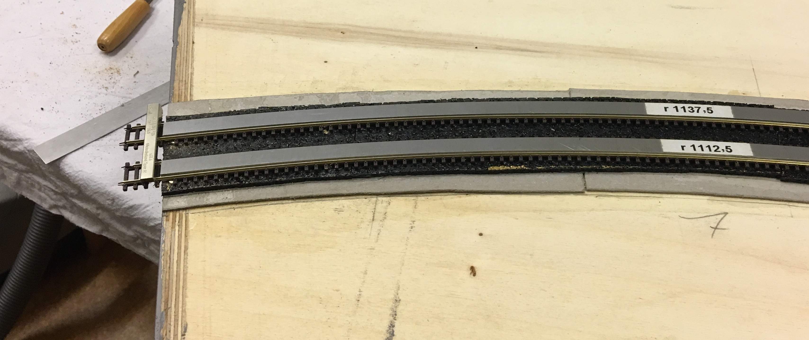 Was aber auf jeden Fall immer eine echte Hilfe ist, ist eine Gleisabstandslehre. Ich habe welche von N-Detail eingesetzt, die haben mehrere "Kerben" für unterschiedliche Gleisabstände. Auch für das Verlegen von Flexgleisen ist es sehr hilfreich, wenn man entsprechende Gleisklemmen verwendet, dann bleibt das in den erforderlichen Radius gedrückte Gleis besser in seiner Form.