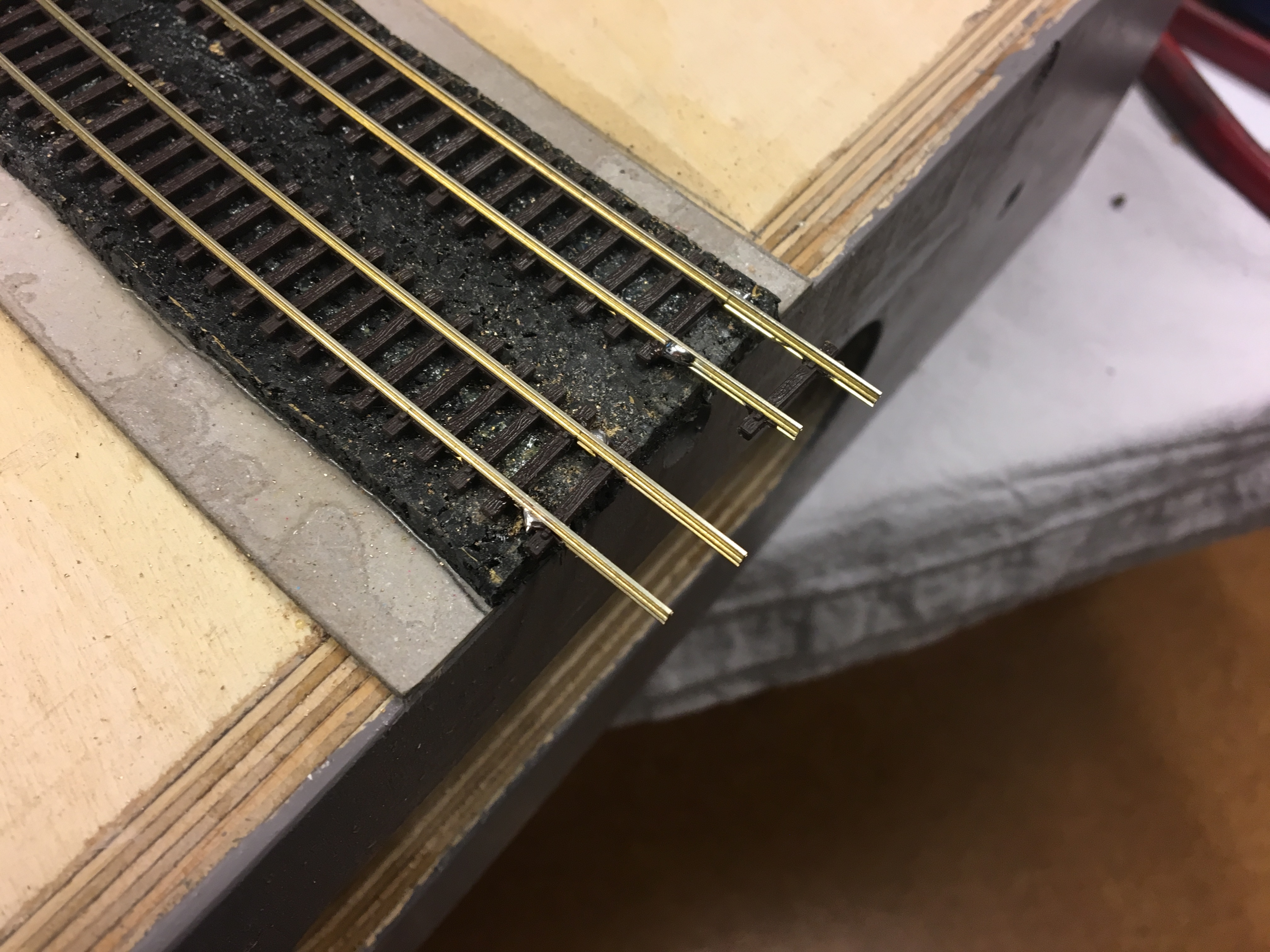 Eine sichere Stromeinspeisung, die am besten noch "unsichtbar" ist, ist für den Spielbetrieb erforderlich. Hier sind die Einspeisestellen unter das Gleis gelötet (Peco Code55 Flexgleis).