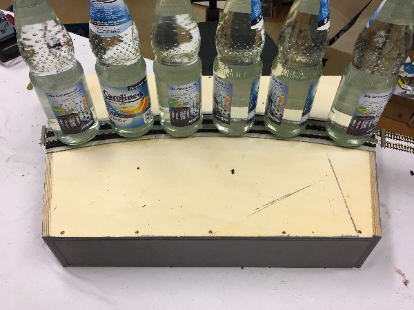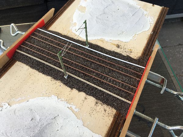 Auf dem Modul wird dann ein entsprechender Gleisunterbau erstellt. Um die Modul-Norm des FREMO zu erfüllen, muß das Gleis auf einer bestimmten Höhe zur Modulkante sein, damit es sich später ohne Übergänge an andere Module anfügen läßt. Bei zweigleisigen Modulen ist auch der Gleisabstand festgelegt.