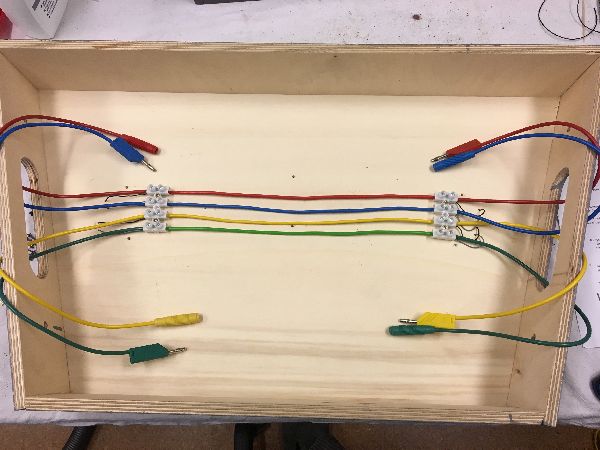 An den Gleisanschlüssen (dünner Draht) wird dann die Einspeiseleitung angeschlossen. Beim Fremo muß jedes Gleis, bei zweigleisigen Modulen jedes Separat, mit Strom versorgt werden. Auch welche Schiene eine Buchse oder einen Stecker bekommt, damit es zum Nachbarmodul kompatibel ist, ist in der Norm festgelegt.