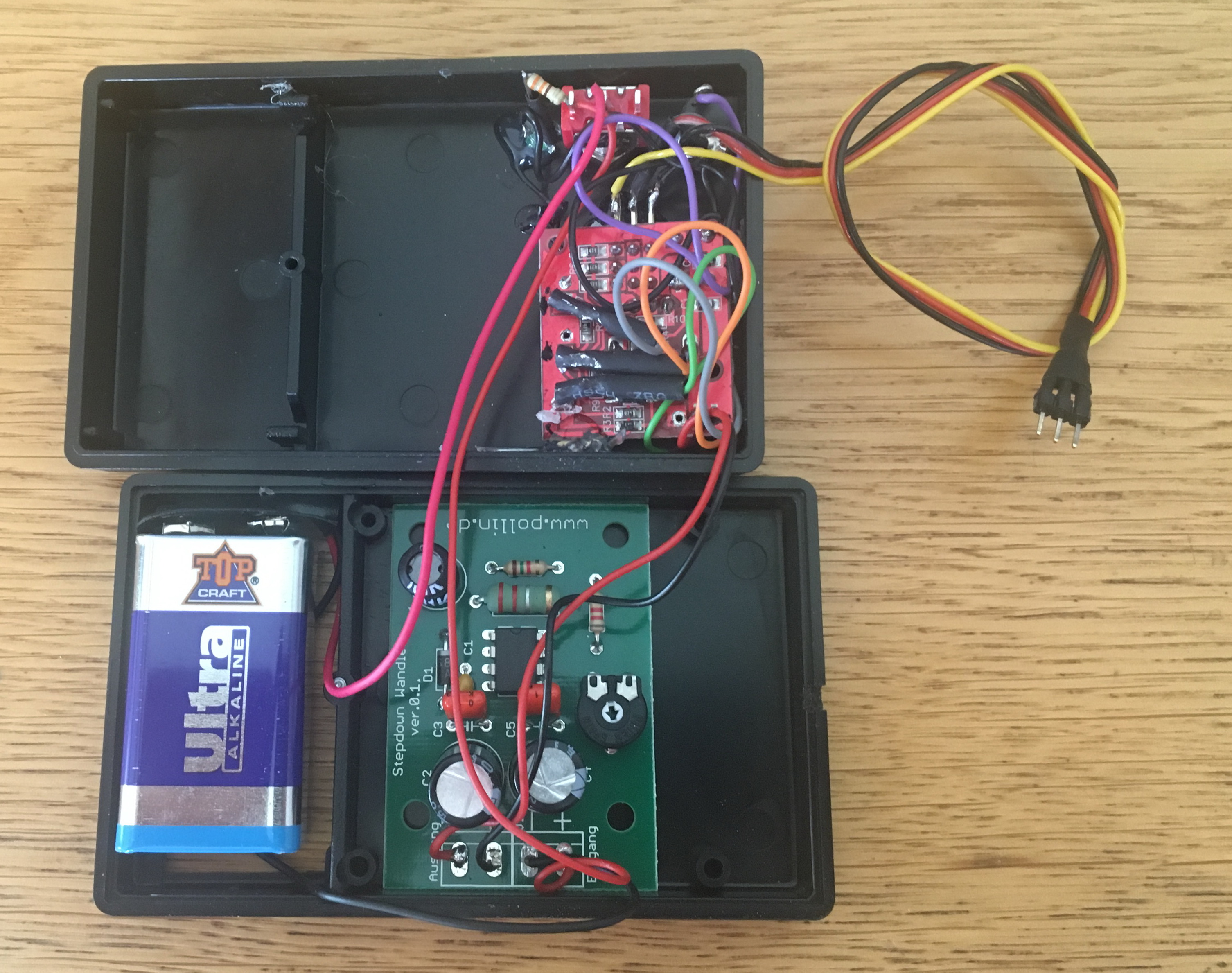 Man muß etwas basteln, damit die Platine, der Step-Down-Wandler, die Batterie, die Dioden, der Schalter und der Taster alles in das Gehäuse passt, geht aber :-)