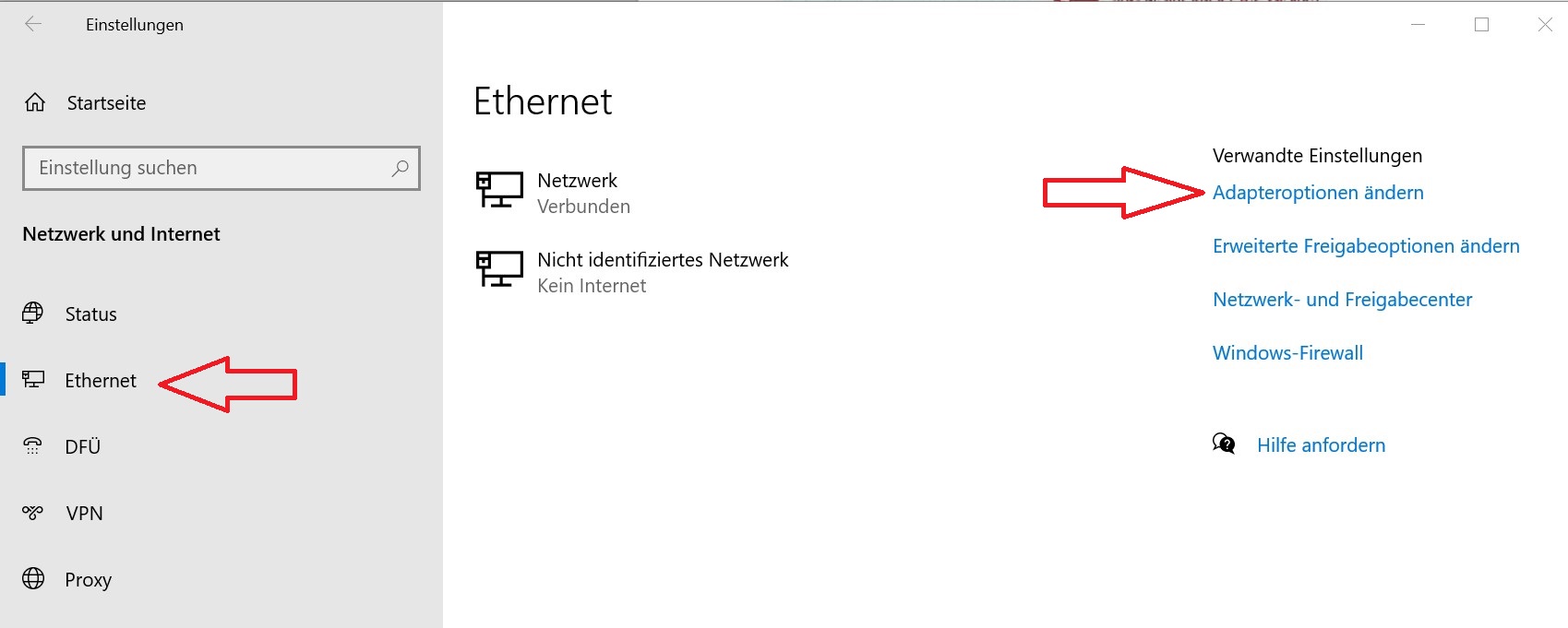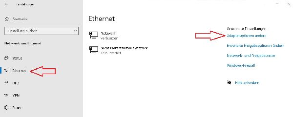 Dadurch öffnen sich die Netzwerk-Einstellungen, hier dann links "Ethernet" auswählen und danach rechts "Adaptereinstellungen ändern" auswählen
