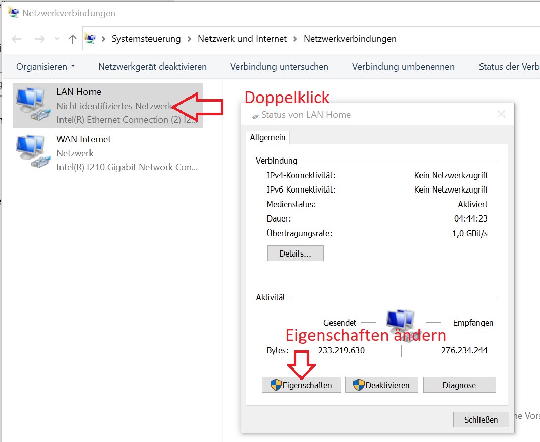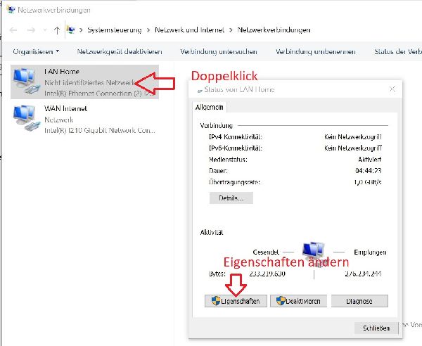 Dort nun den Netzwerk-Adapter mit Doppelklick auswählen, es steht dort wahrscheinlich unter dem LAN-Symbol "nicht Verbunden" wenn das Netzwerk-Kabel aus dem Computer gezogen wurde