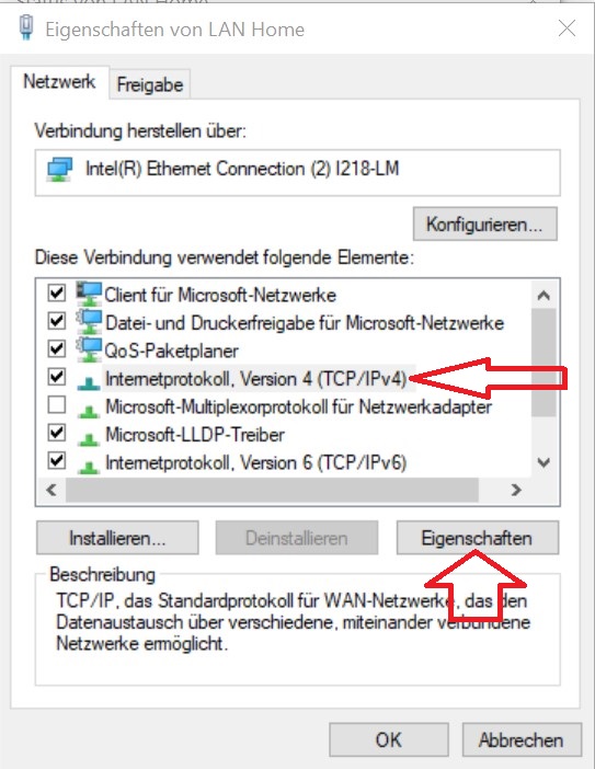 Den Eintrag IPv4 anwählen, unten dann auf Eigenschaften klicken