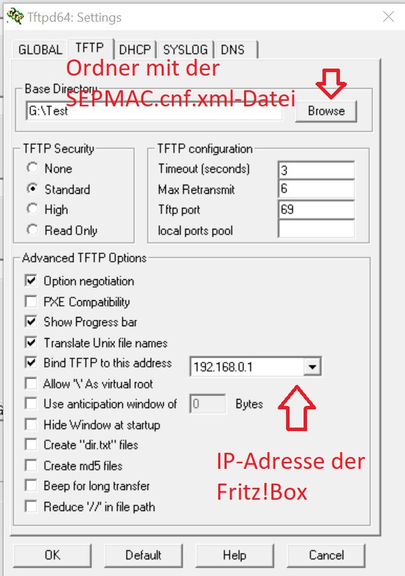 Zunächst muß eine TFTP-Software auf einem Computer installiert werden, es gibt viele Möglichkeiten dies zu machen, eine davon ist es mit TFTPD64 zu machen - diese Software ist kostenlos, verbraucht keinen großen Speicherplatz und kann nach dem das Telefon seine SEPMAC.cnf.xml-Datei bezogen hat, wieder beendet/deinstalliert werden.
