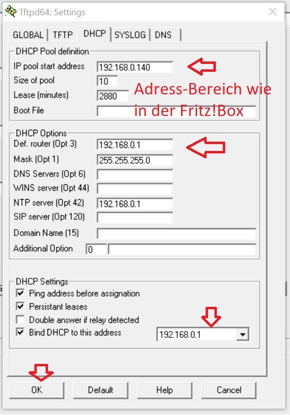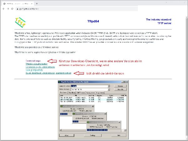 Nach dem Drücken der OK-Taste kann die Meldung kommen, dass die Software neu gestartet werden soll - also TFTPD64 beenden, neu starten und diese zuvor getätigten Einstellungen kontrollieren.
