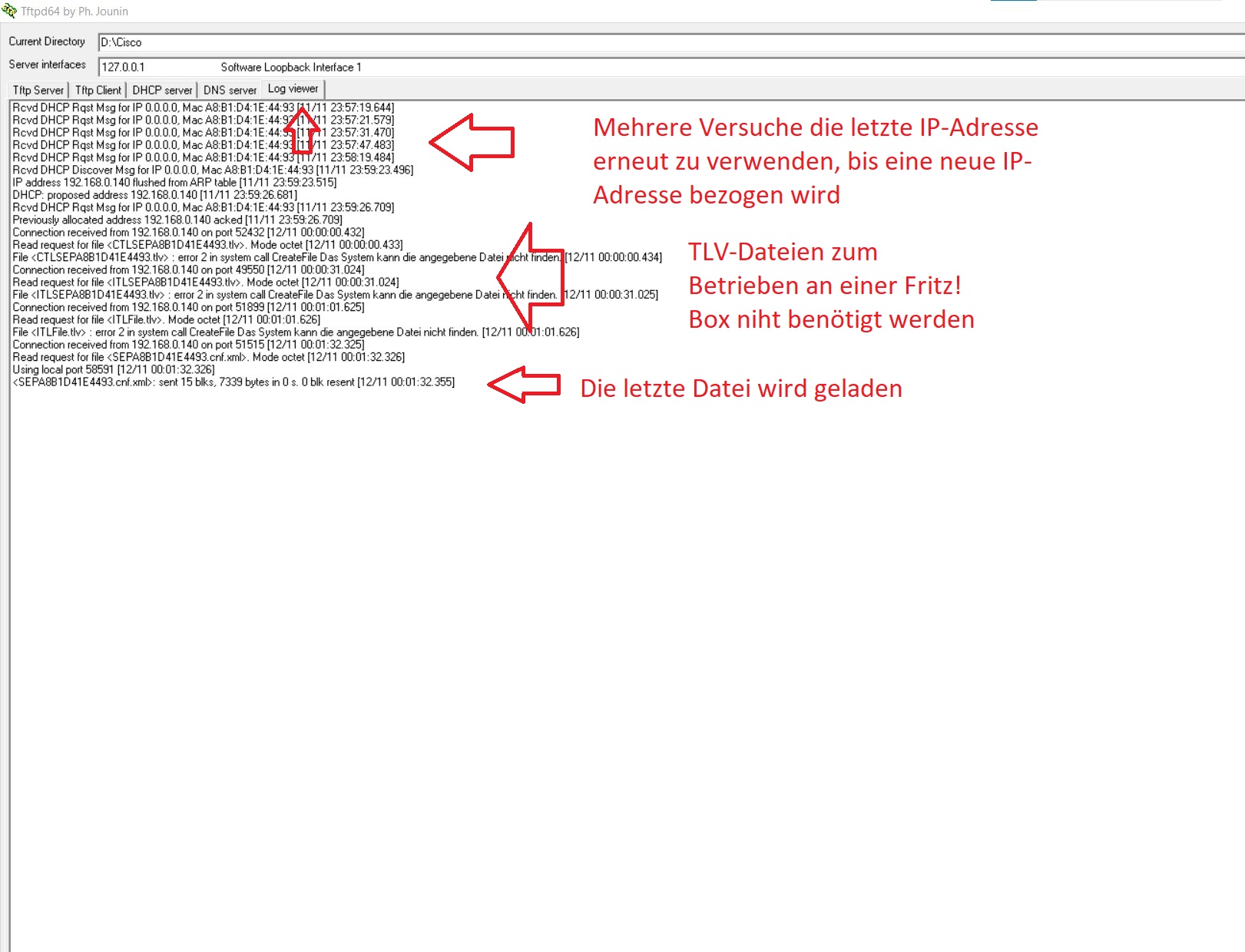 Das Telefon bezieht nun nach dem Booten eine IP-Adresse aus dem eingestellten Adressbereich und versucht mehrere Dateien zu laden, bis dann die SEPMAC.cnf.xml geladen wird. Das kann mehrere Minuten dauern.