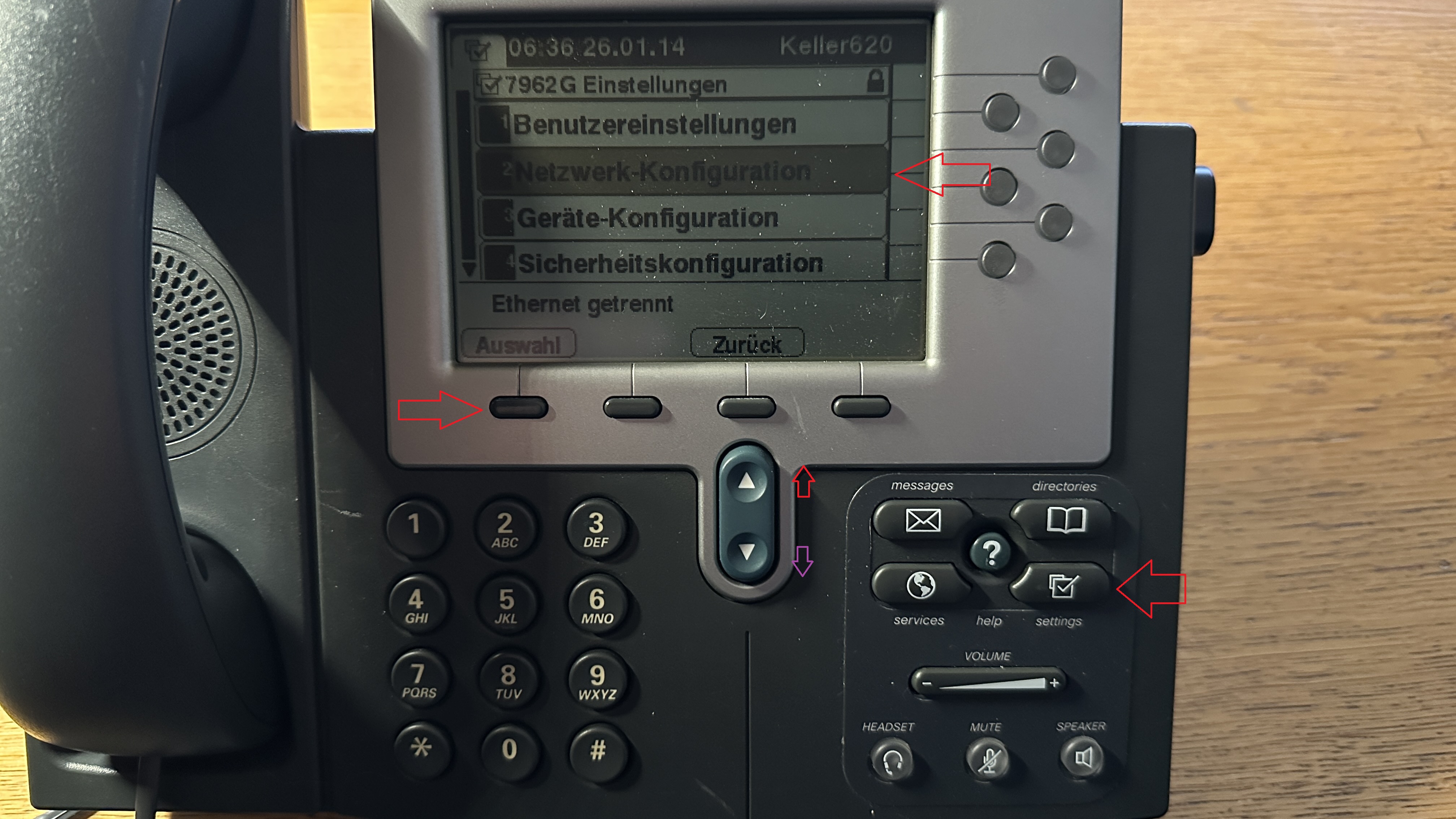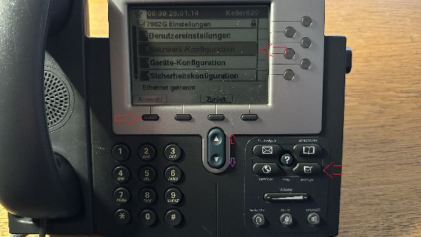 Um die Netzwerk-Einstellungen zu prüfen oder zu verändern mit der Taste "Settings" rechts in das Geräte-Menü einsteigen, mit den rauf-/runter-Tasten den Eintrag "Netzwerk-Konfiguration" anwählen und mit "Auswahl" bestätigen