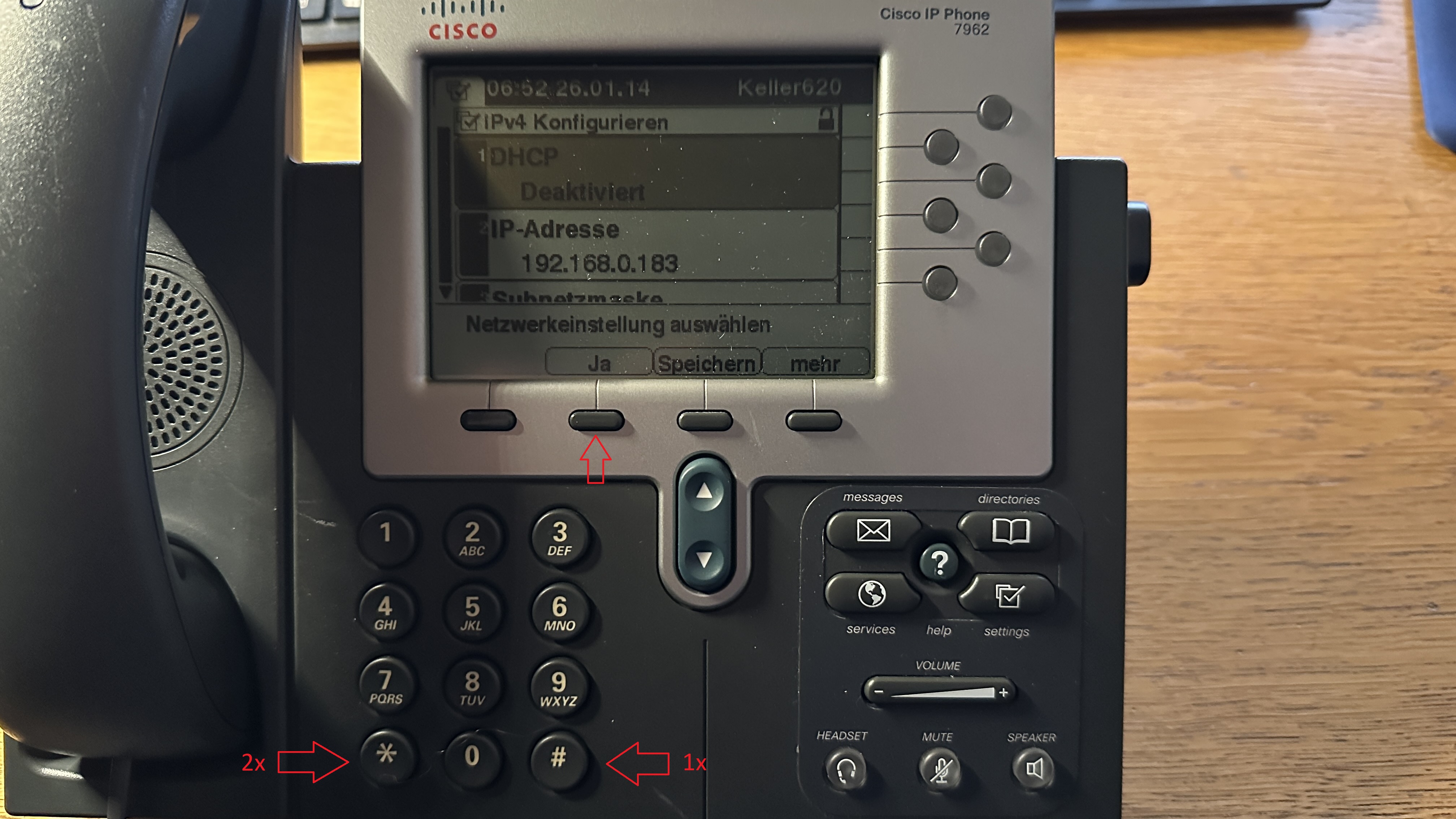 Es wird nun angezeigt, ob das Telefon auf DHCP eingestellt ist. Die weiteren IP-Adressen sind zunächst unrelevant, solange das Telefon noch nicht mit dem Netzwerk-Kabel am Computer angeschlossen ist.