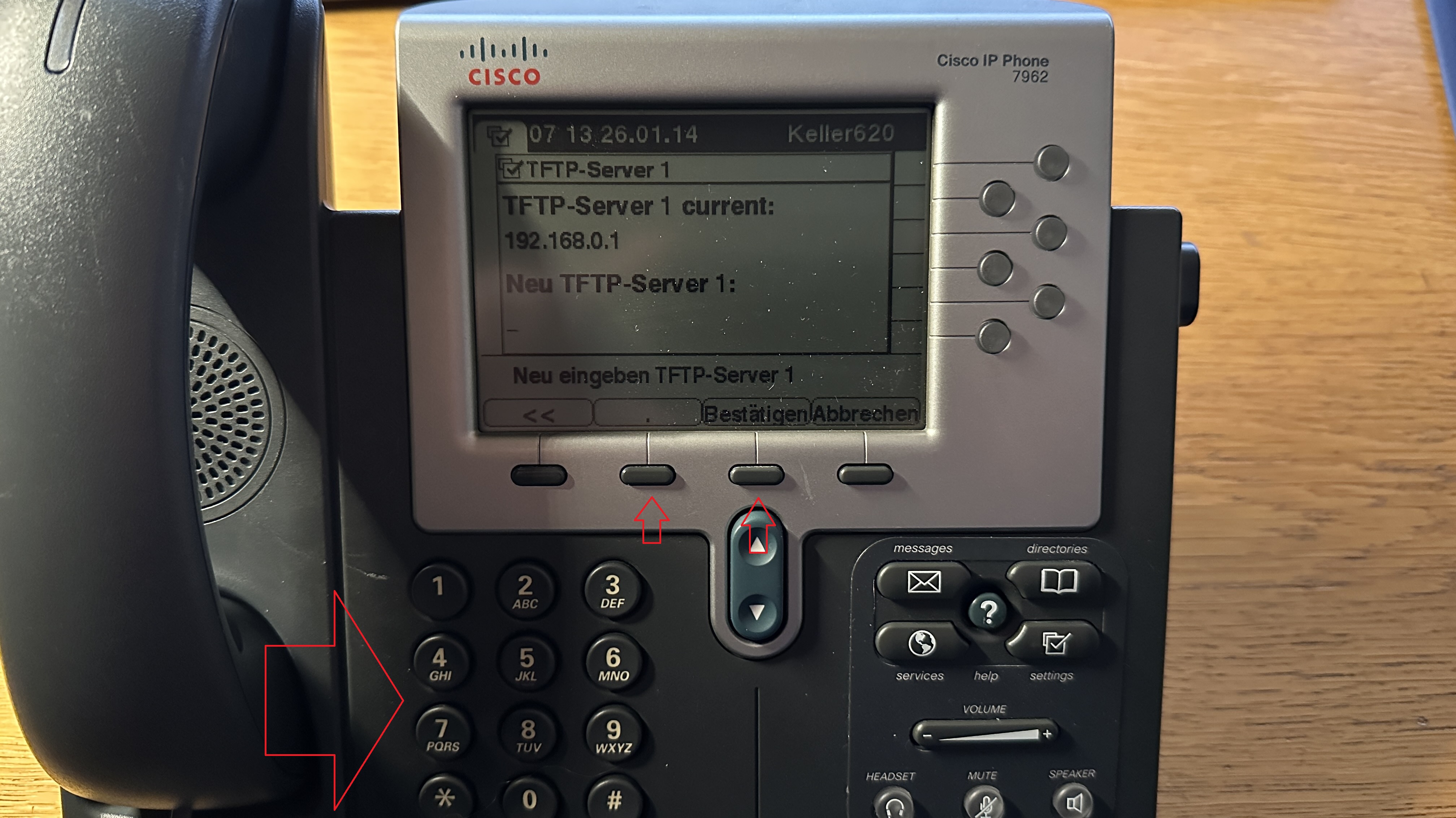 Nun mit den rauf/runter-Tasten weiter nach unten scrollen bis zum Eintrag "TFTP-Server 1". Ist hier nicht die Adresse der Fritz!Box angegeben, muß dieser Eintrag entsprechend angepasst werden.