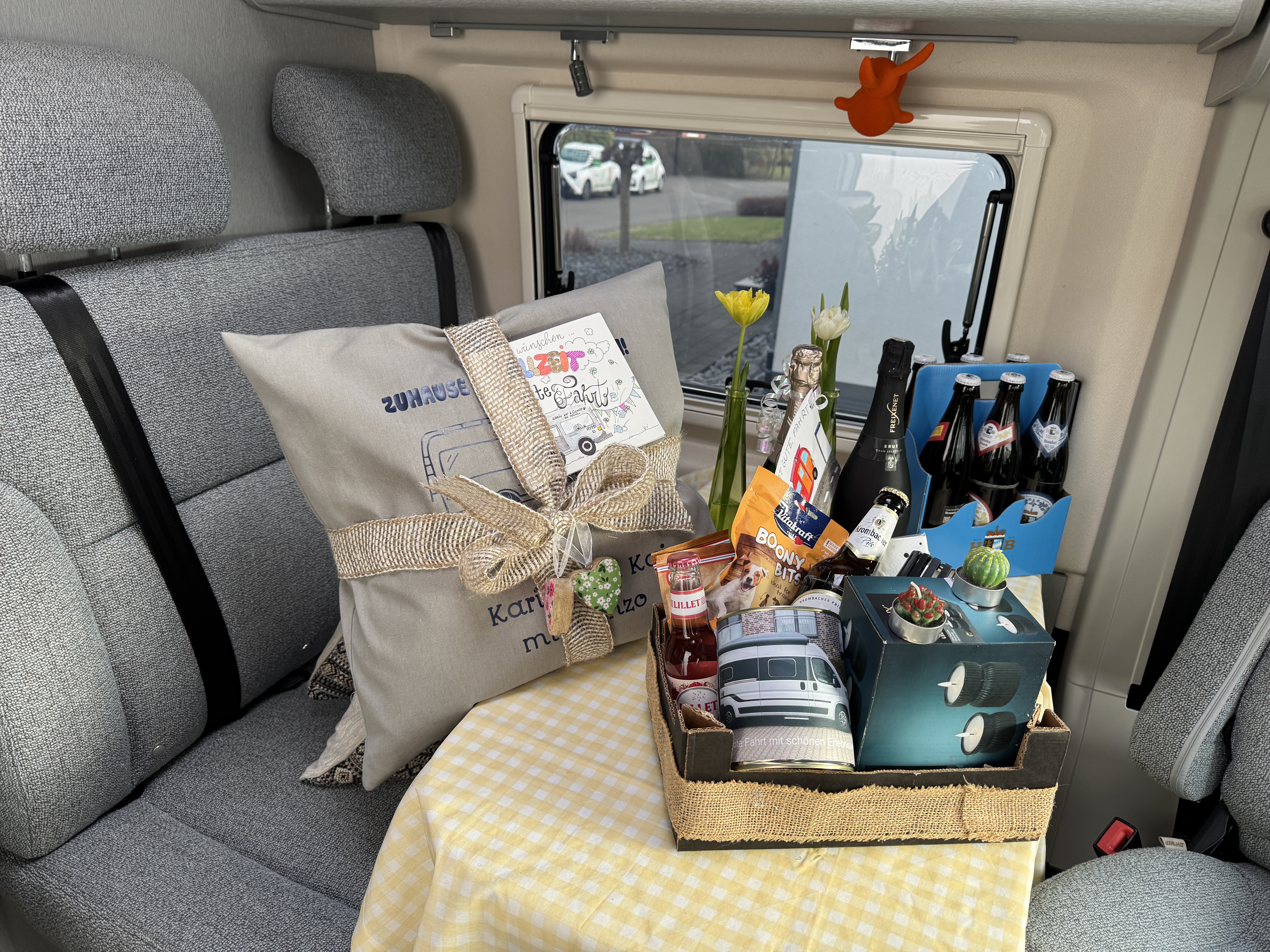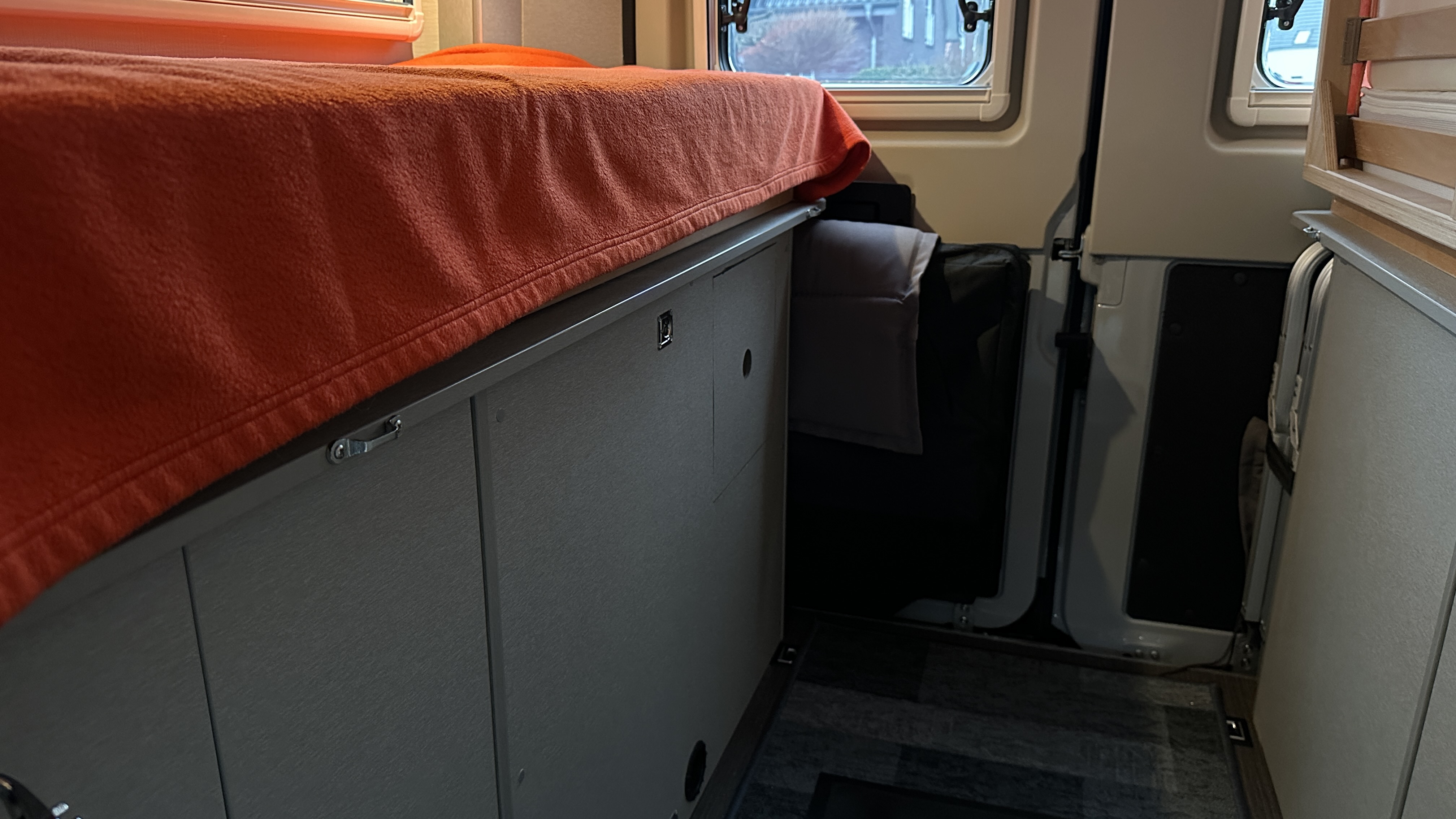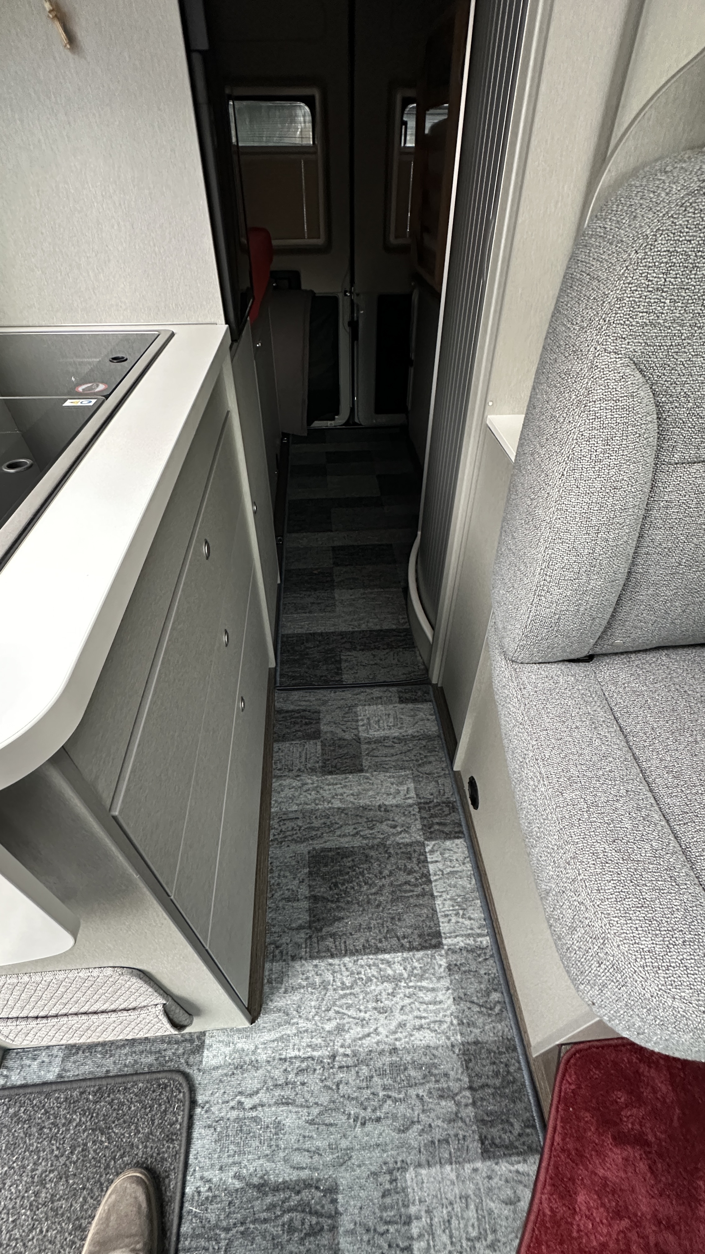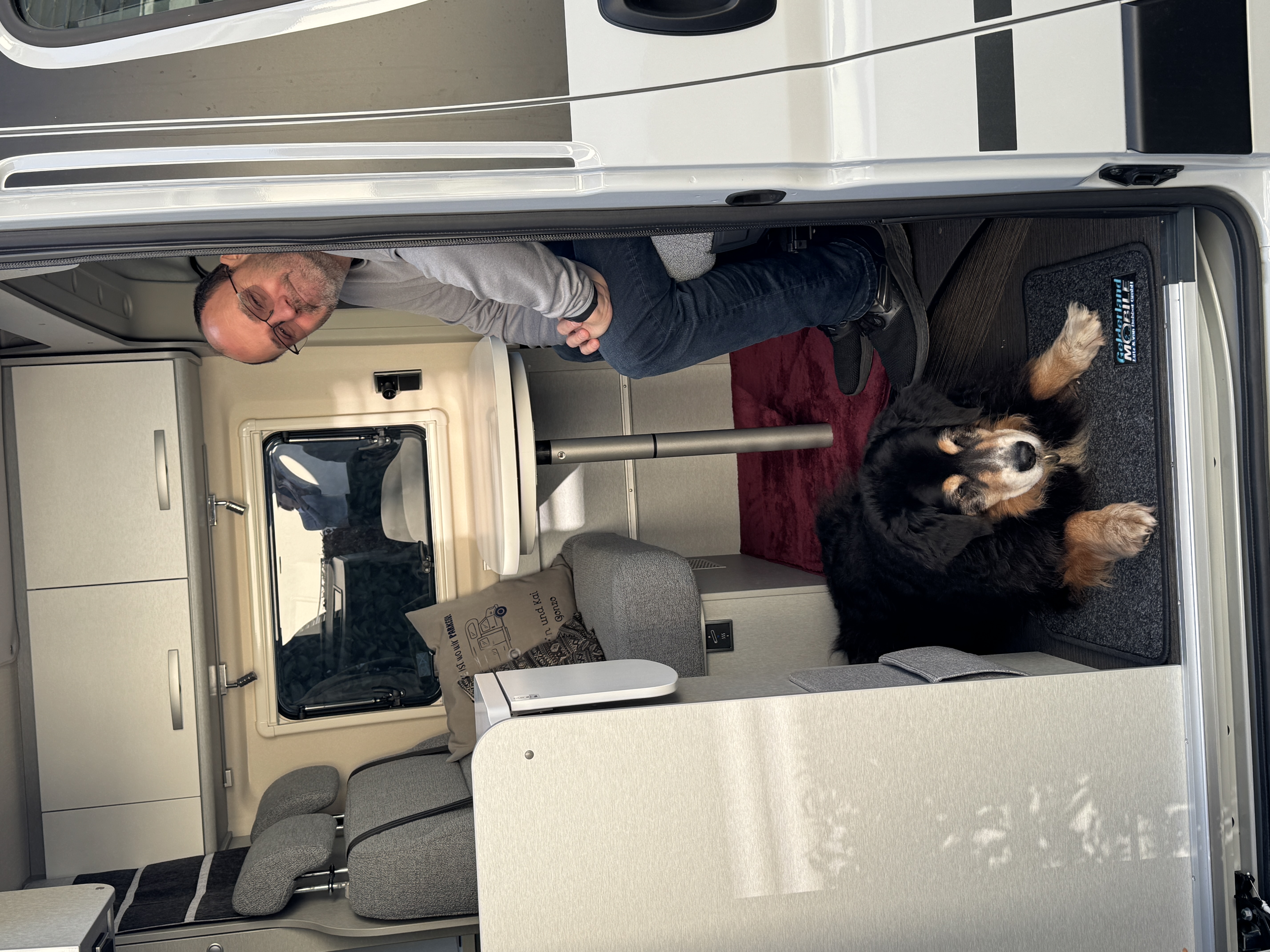 Wir haben Teppich im Sitzbereich, im Bereich vor Küche/Bad und im Heckbereich verlegt. Der rote Flokati ist Gonz's Lieblingsplatz geworden