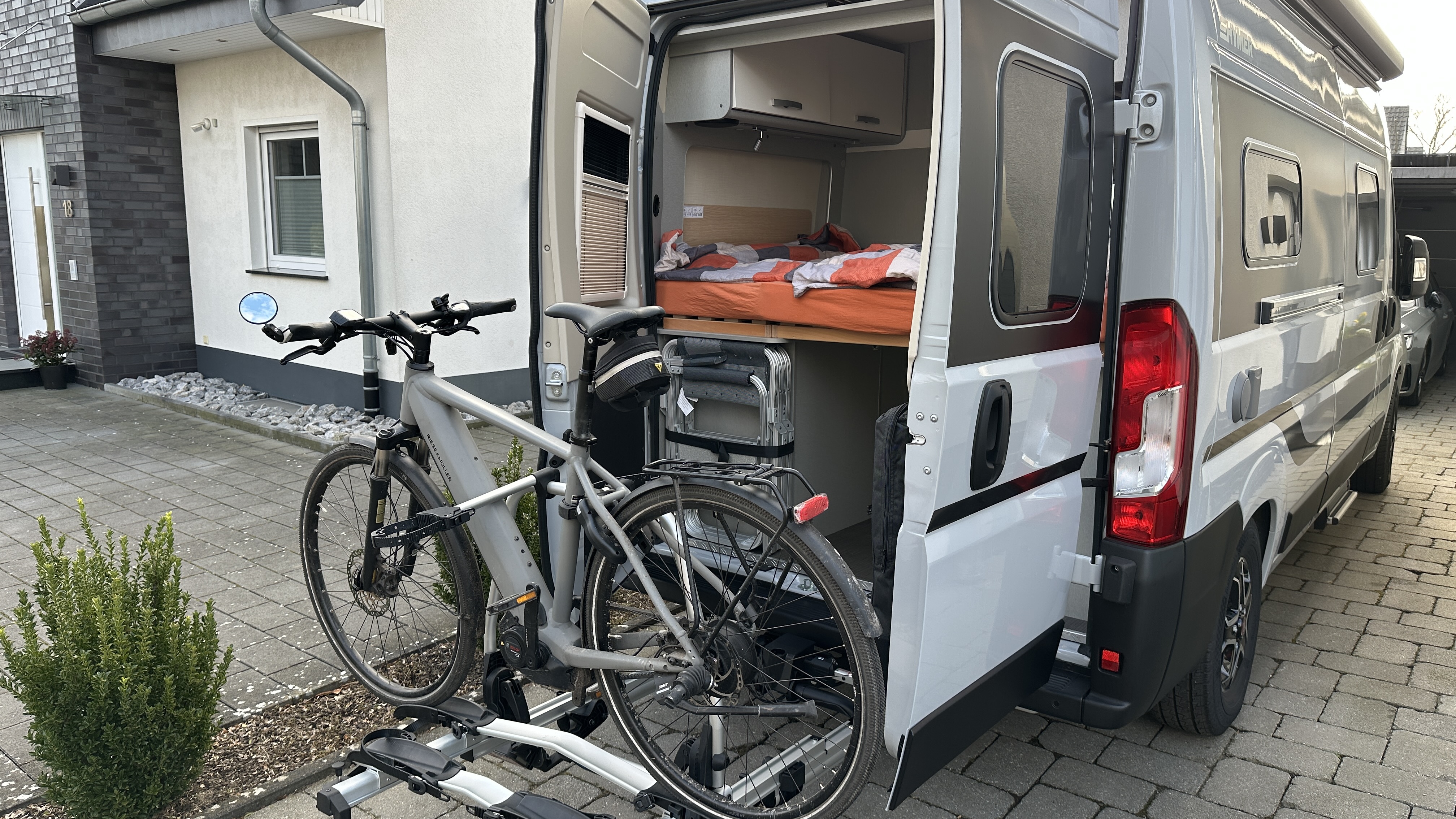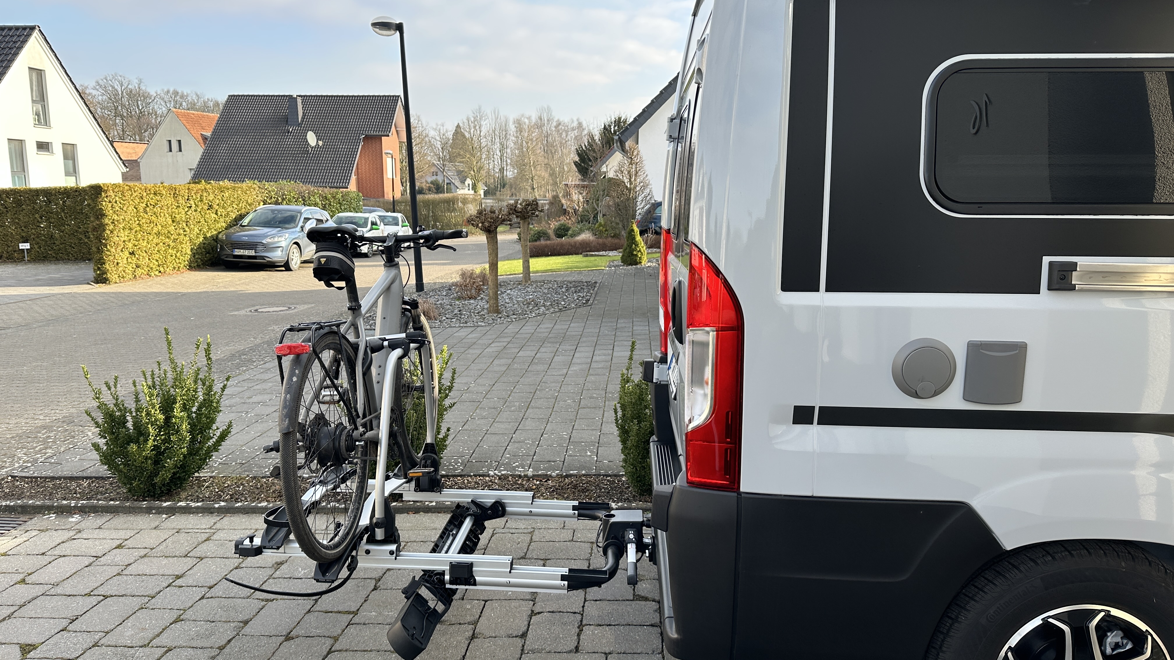 Damit der Träger für die Fahrräder kein Problem ist, bzw. sich die Hecktür noch öffnen läßt, haben wir den Träger "Eufab SD260" gewählt. Dieser kann mit aufgespannten Fahrrädern (max 60kg Beladung) nach hinten vom Fahrzeug weg gezogen werden, damit die Türen ungehindert geöffnet werden können.