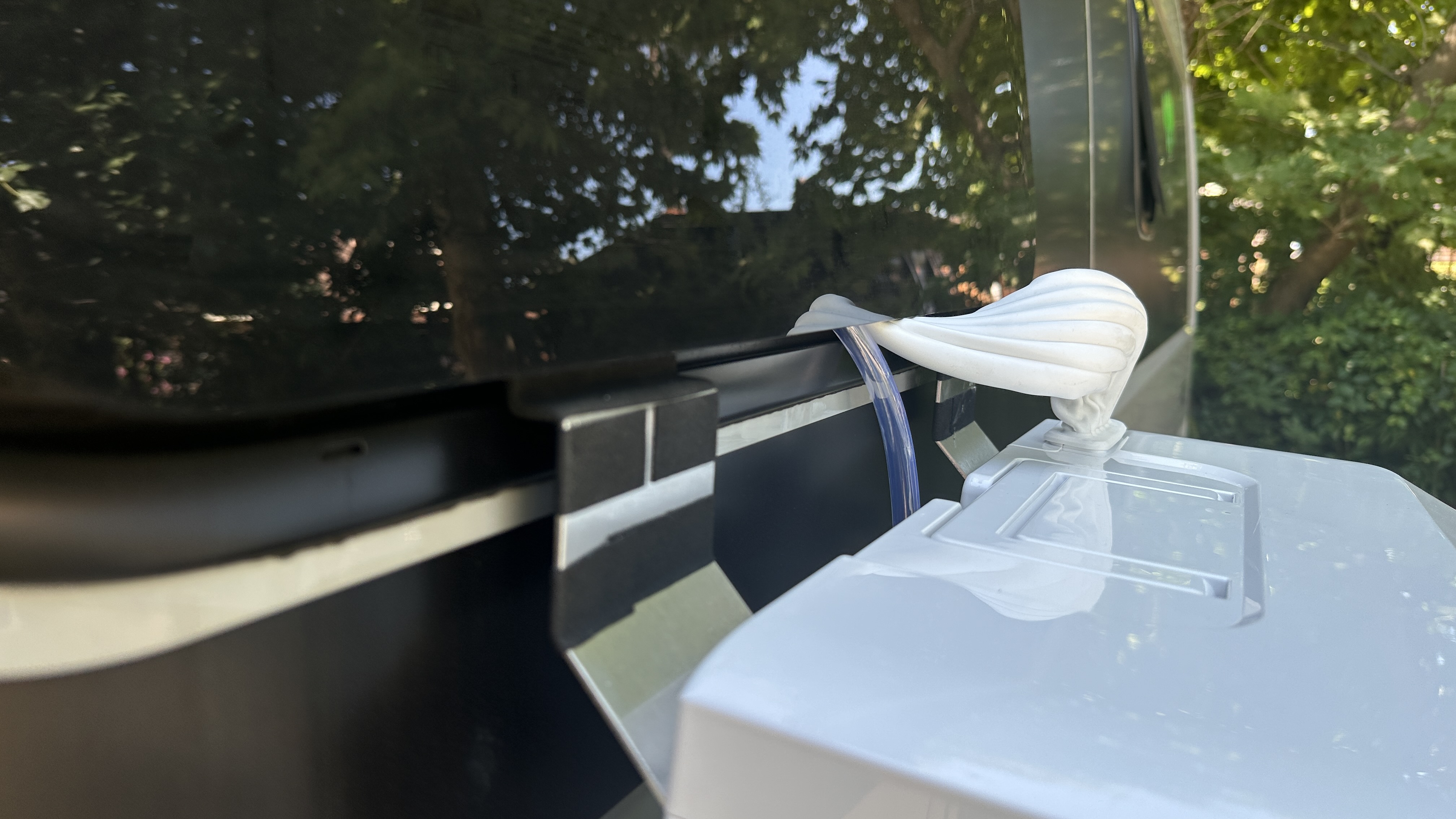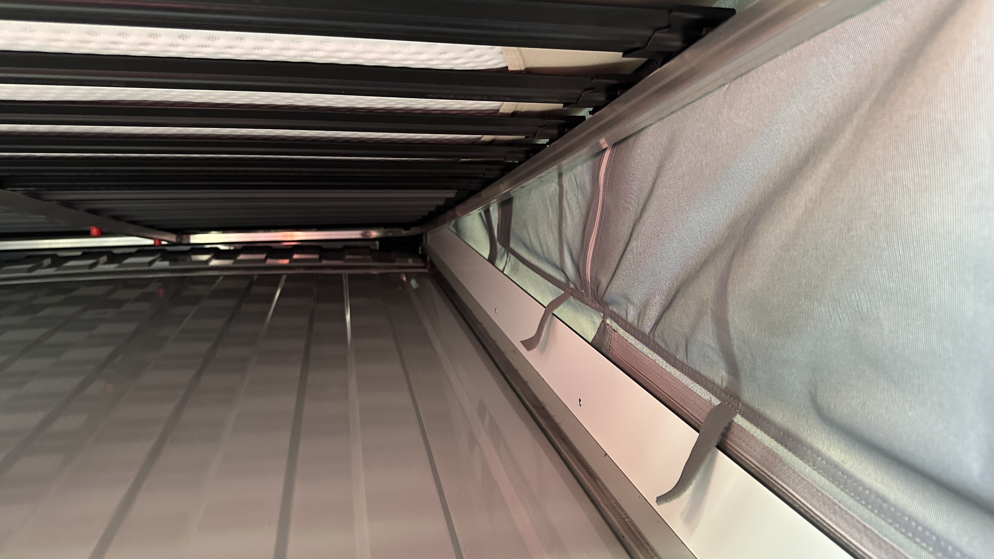 Die Halterung, die in das Fenster gehängt wird, hat nicht gut gepasst. Das Fenster hätte man mit dem Original-Teil nicht schließen können, die Abstützung wäre nur auf dem Verdunklungs-Rolo gewesen, also habe ich ein entpsrechendes Blech konstruiert und herstellen lassen. Das passt so, wie ich es mir vorstelle. Hier noch mit provisorischen Eckenschutz / Gummi-Auflage, das Material wurde leider nicht mehr rechtzeitig geliefert,
