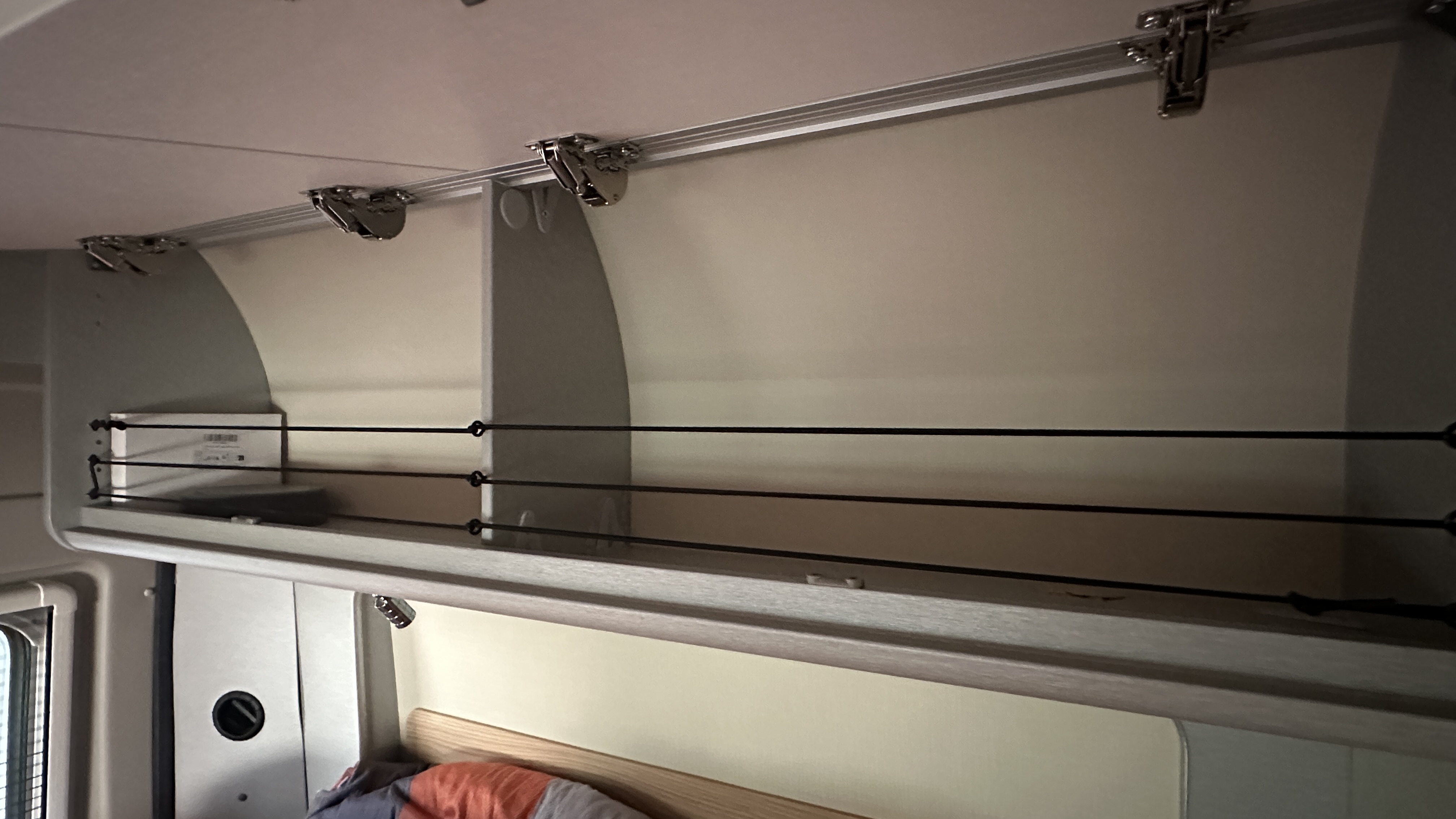 Die Hängeschränke im Heck habe ich mit einer Reling versehen, mir sind immer die Kleidungsstücke rausgefallen …