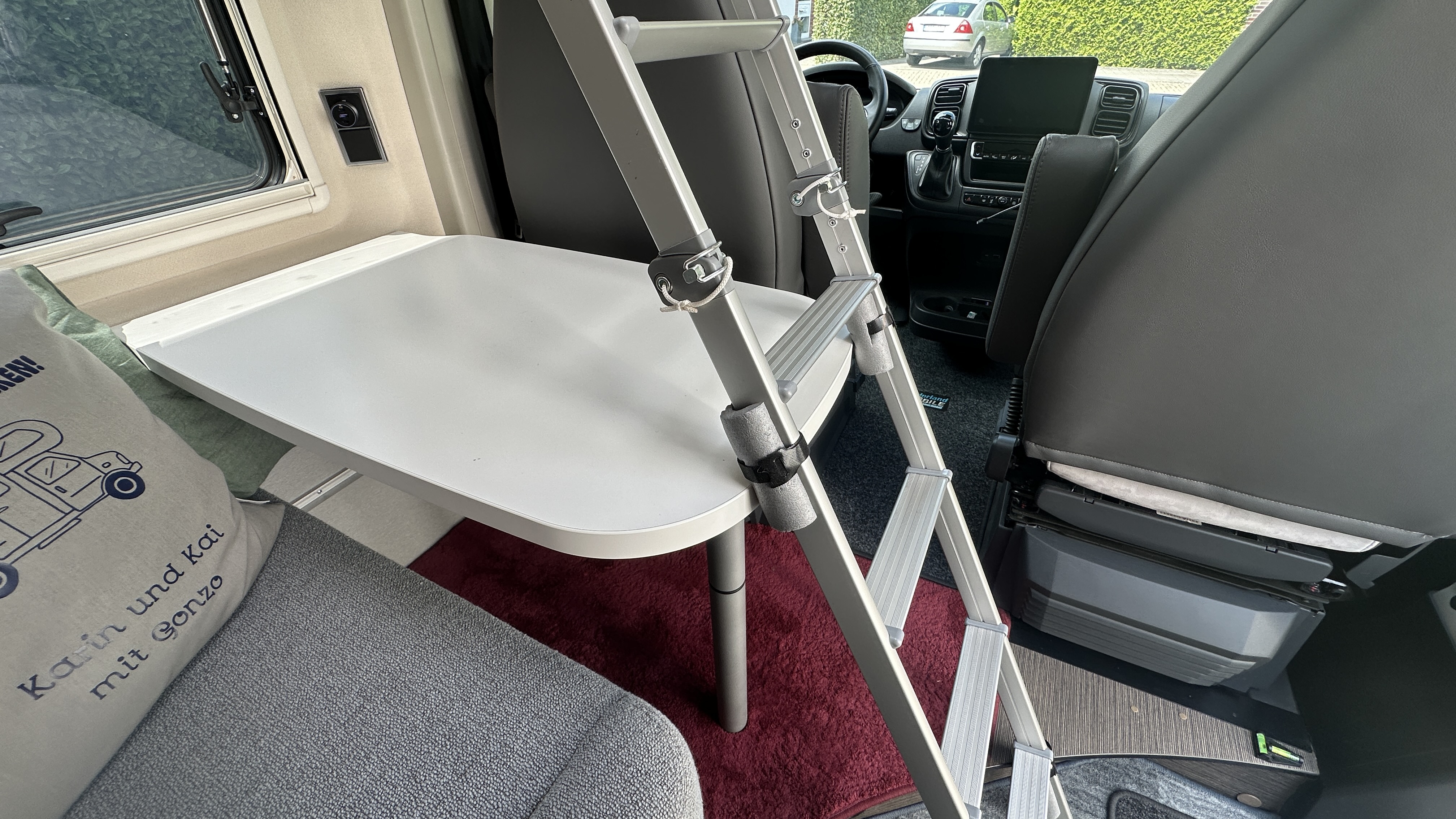 So kann die Leiter stehen bleinben, man kann noch am Tisch sitzen (Fahrersitz gedreht), ideal …