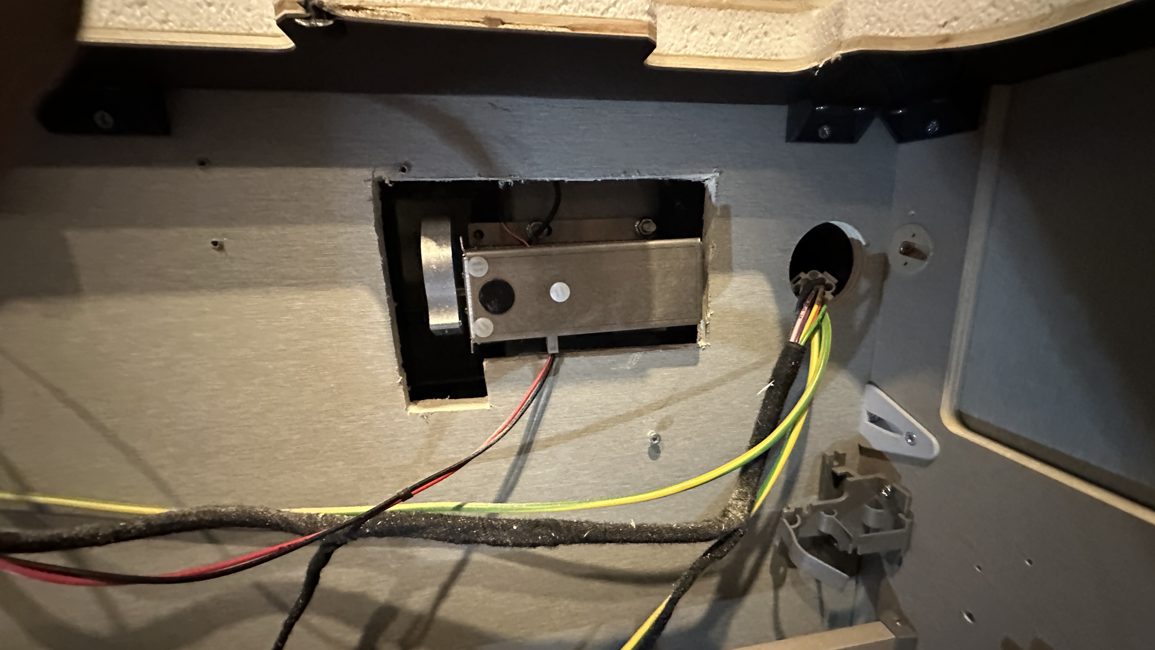 Loch in die Rückwand schneiden, am Mückenschutz-Rolo muß auch ein Ausschnitt rein, einige Kabel verlegen, alles wieder einbauen …