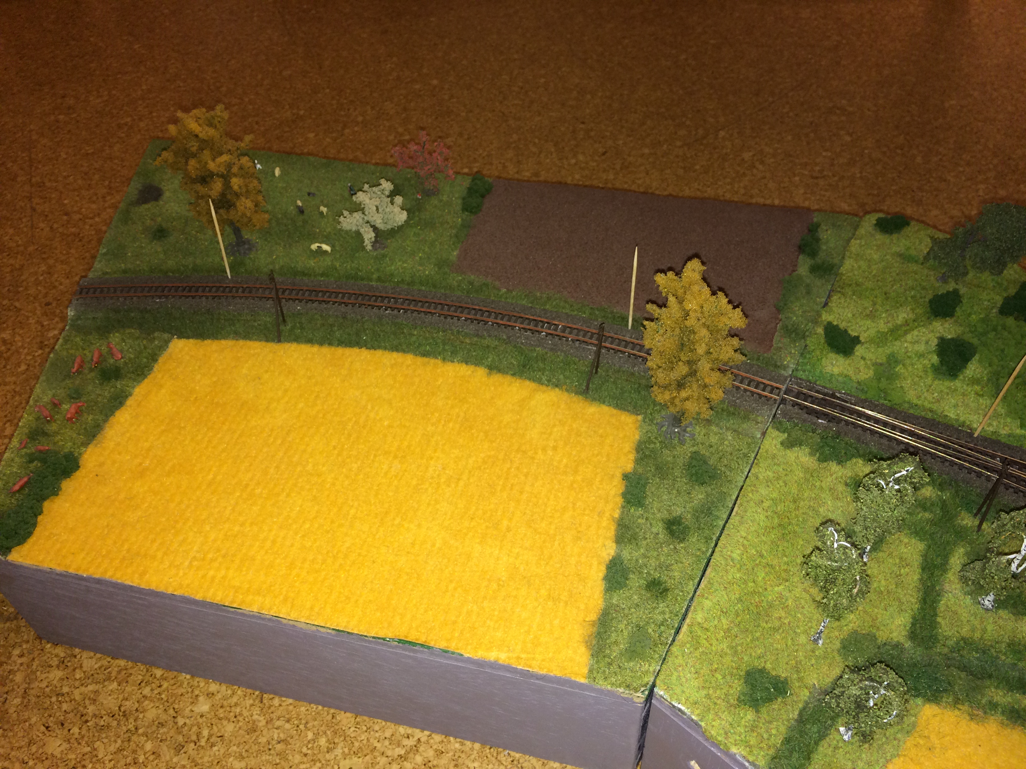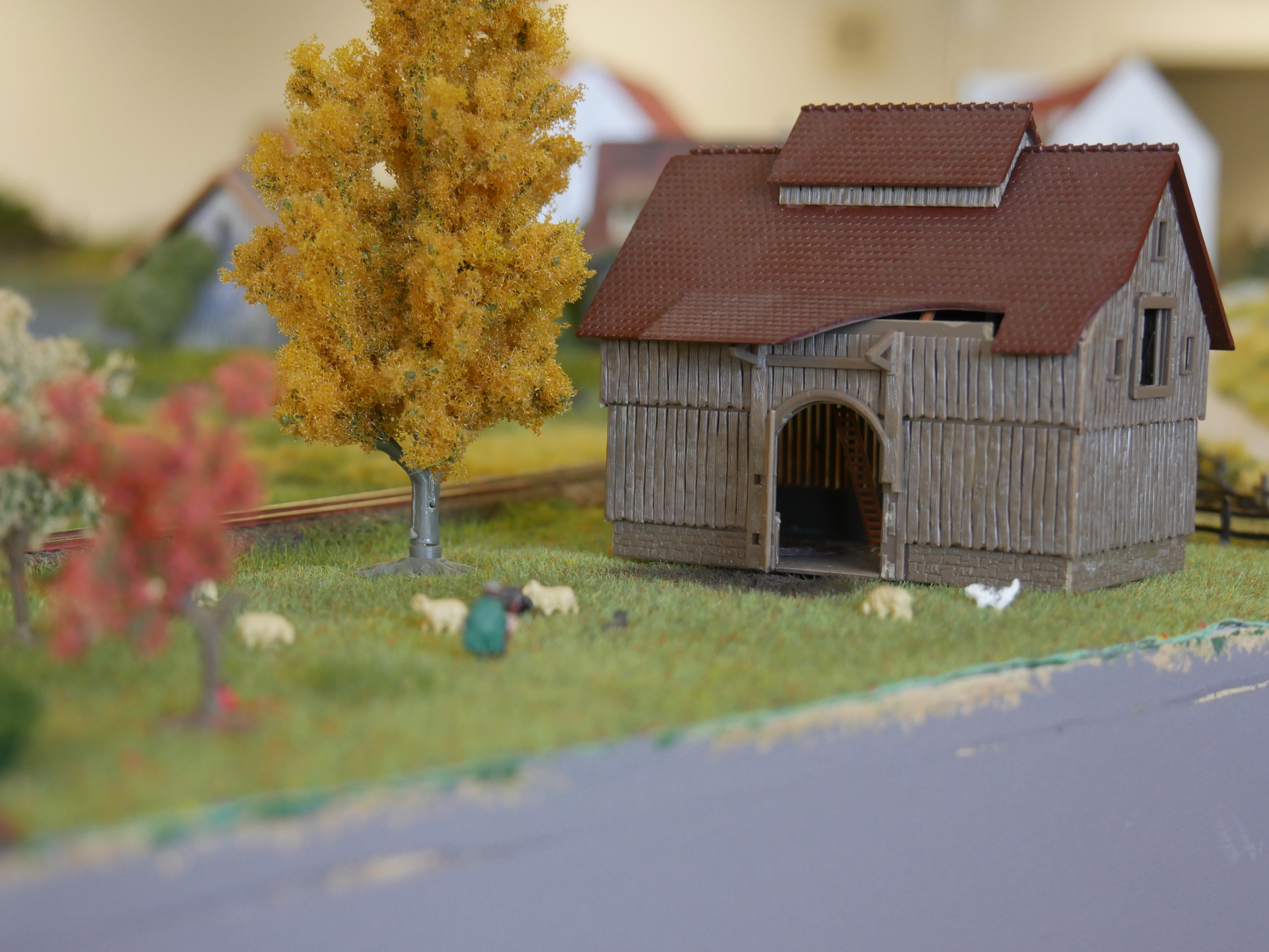 Es wurde ein eingleisiges 30° Bogenmodul mit r900 mm, einem Kornfeld und einer Schafherde an der Scheune, Kernobstwiese …
