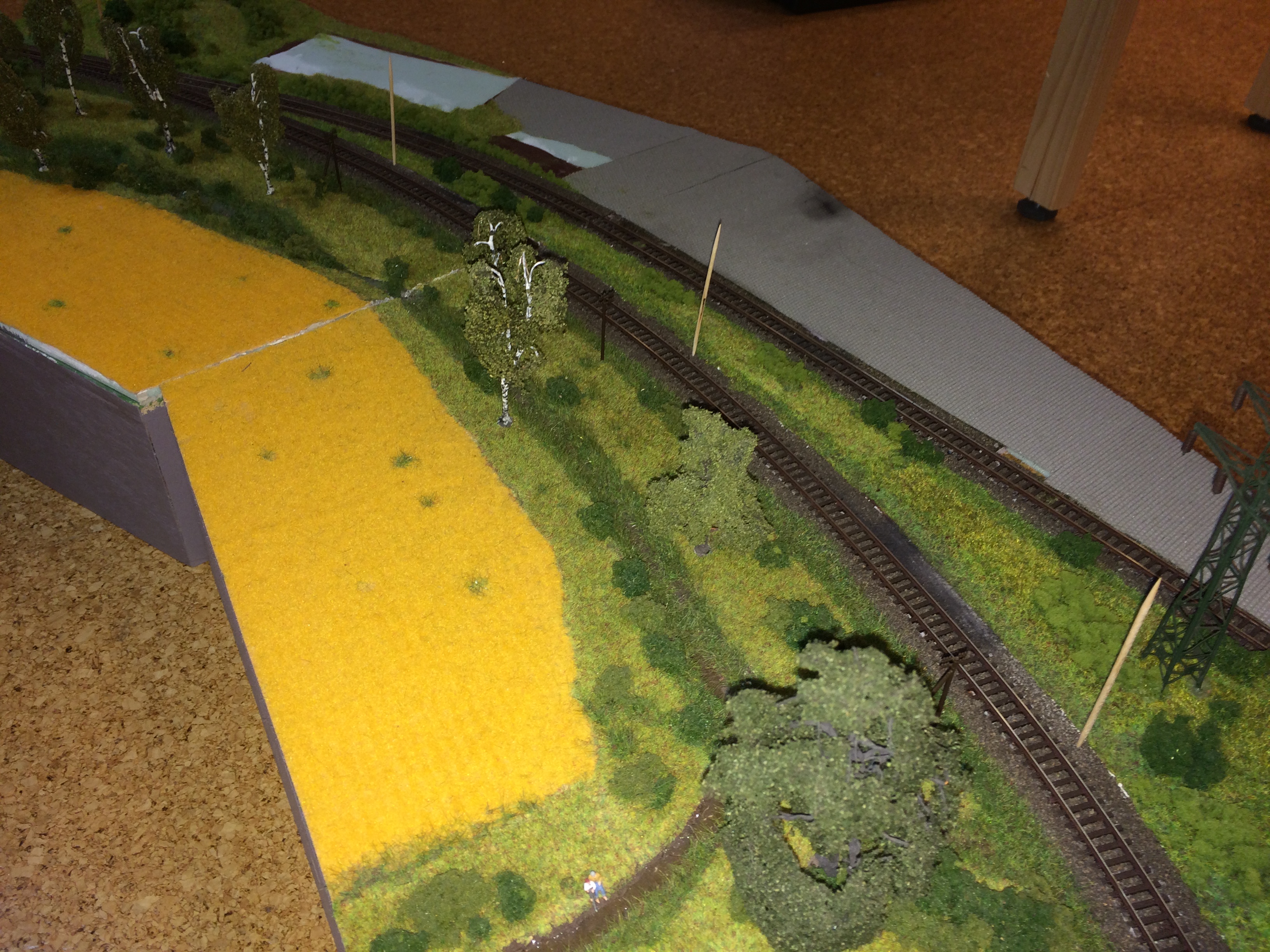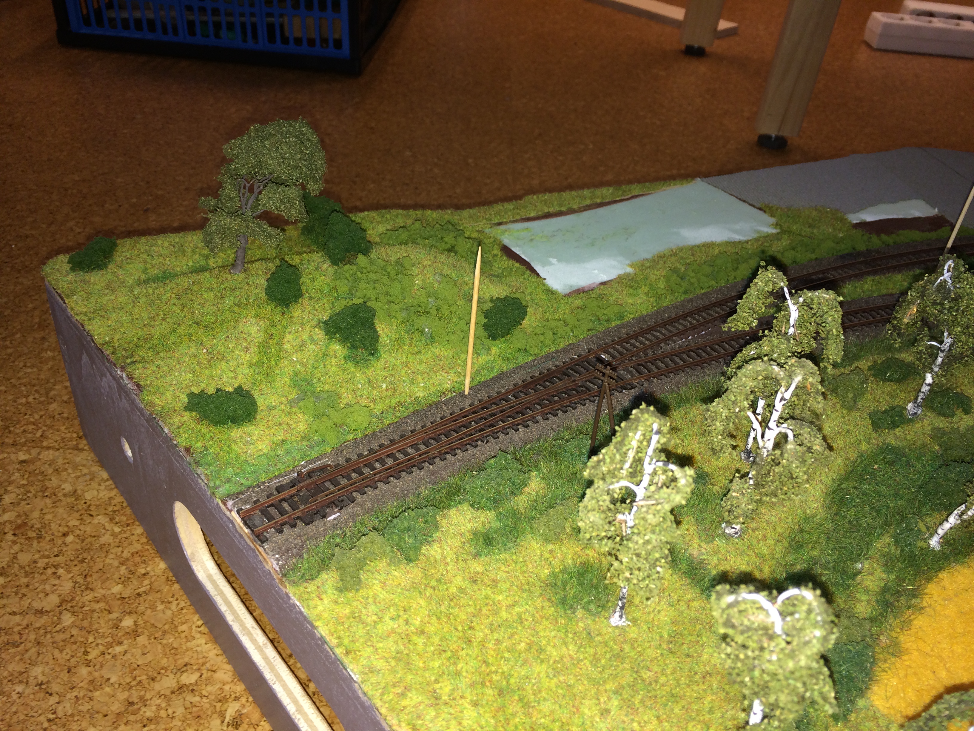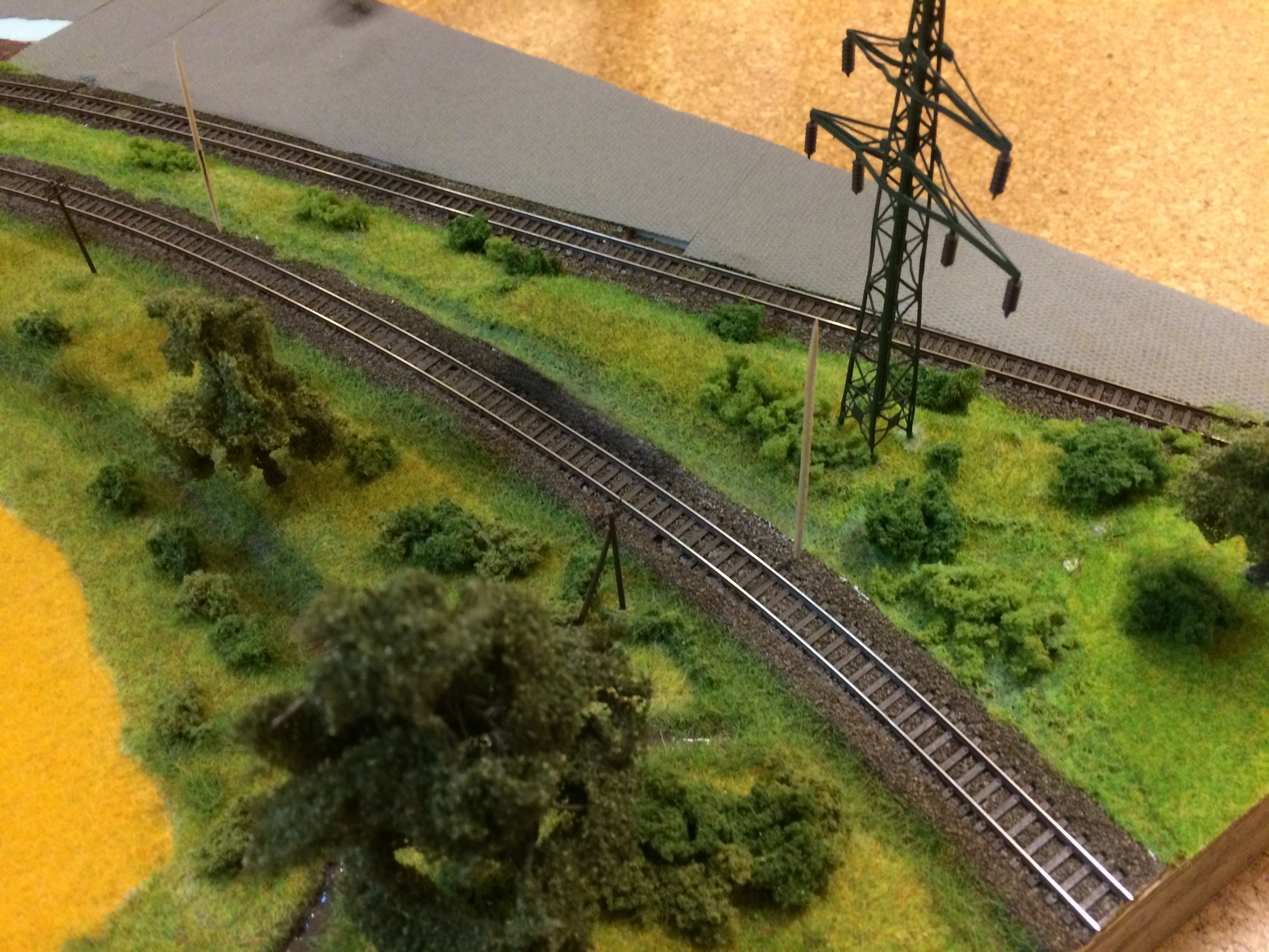 Ich habe mal mit Zahnstochern die mögliche Position von Oberleitungsmasten bestimmt. Es könnte kurzfristig damit ausgestattet werden. Die Module Stammtisch I und II haben schon Masten.