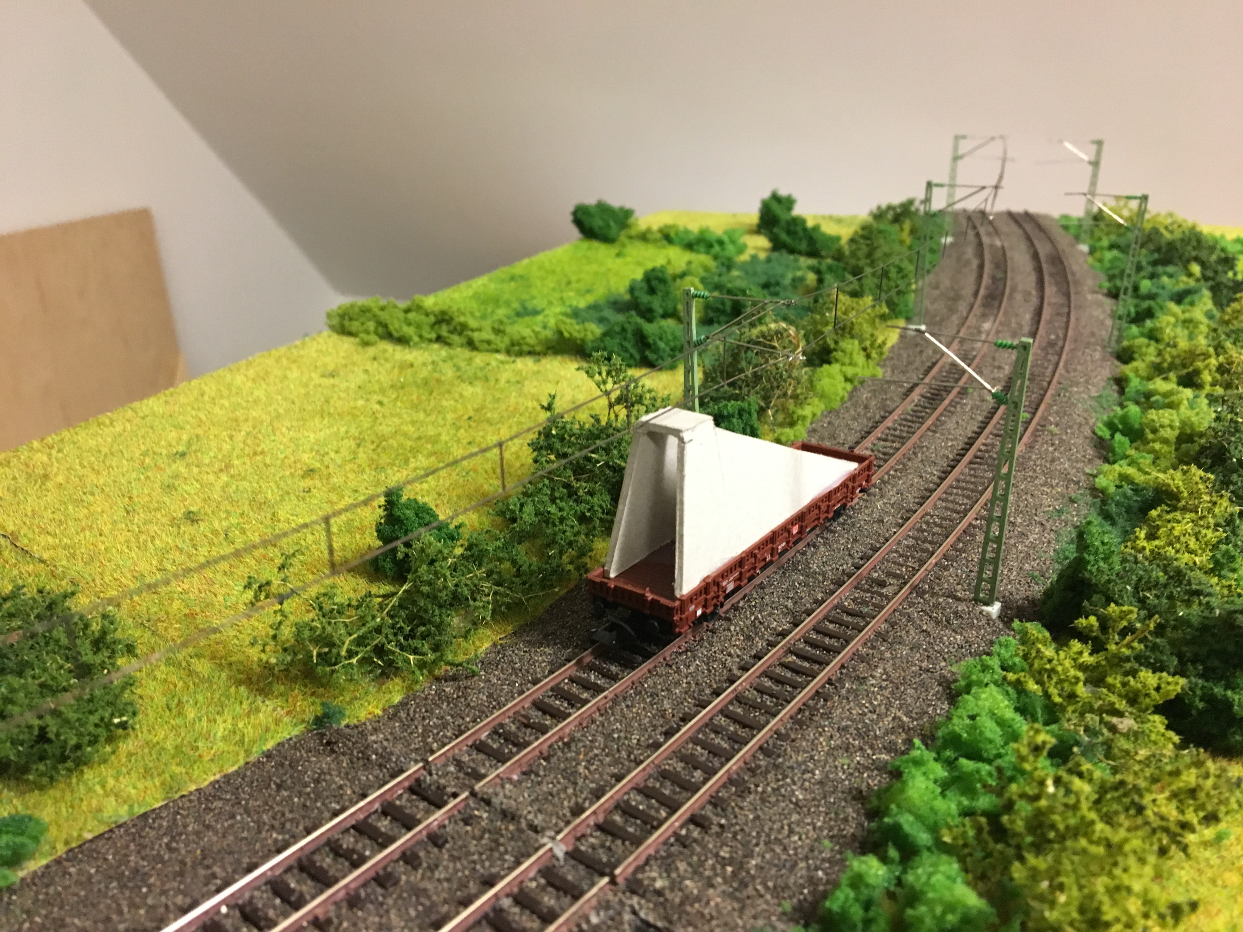 Ein defekter Rungenwagen dient hier als Einstelllehre für den Fahrdraht